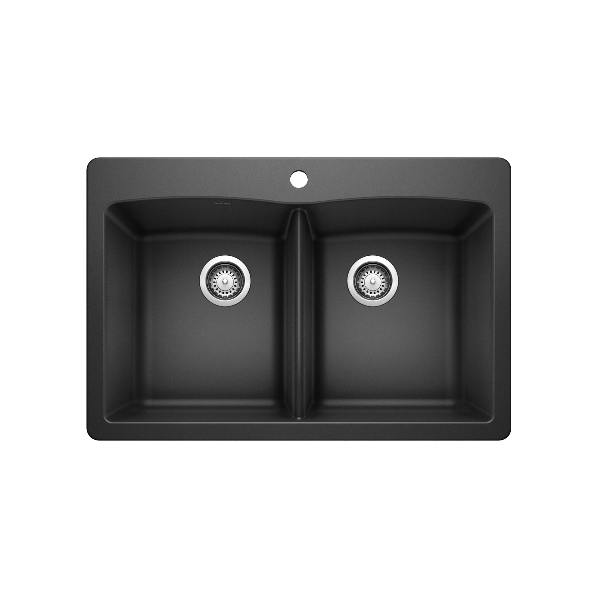 Drop-in kitchen sink in SILGRANIT, granite composite. Large, deep, equal double bowls handle heavy duty washing and prepping with ease